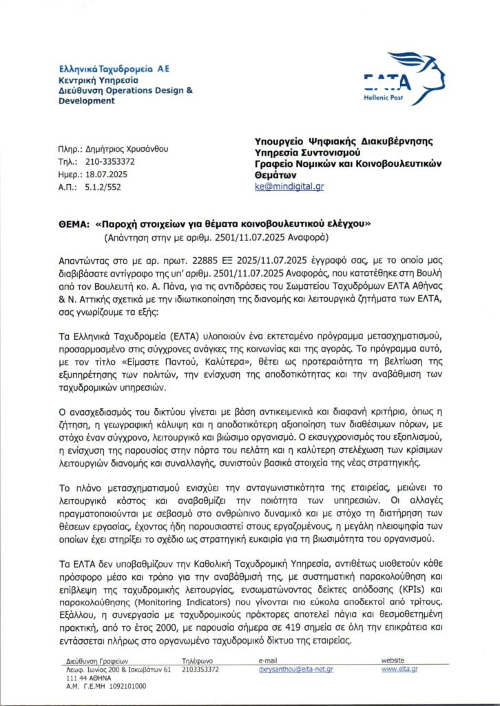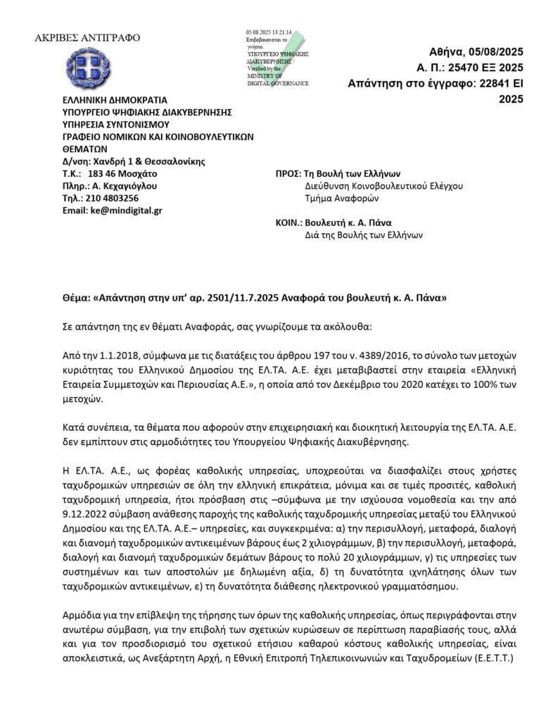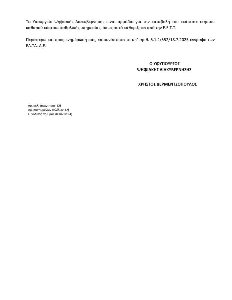 ΑΠΑΝΤΗΣΗ ΤΟΥ ΥΠΟΥΡΓΕΙΟΥ ΨΗΦΙΑΚΗΣ ΔΙΑΚΥΒΕΡΝΗΣΗΣ ΣΤΟΝ ΒΟΥΛΕΥΤΗ ΠΑΣΟΚ-ΚΙΝΗΜΑΤΟΣ ΑΛΛΑΓΗΣ.
