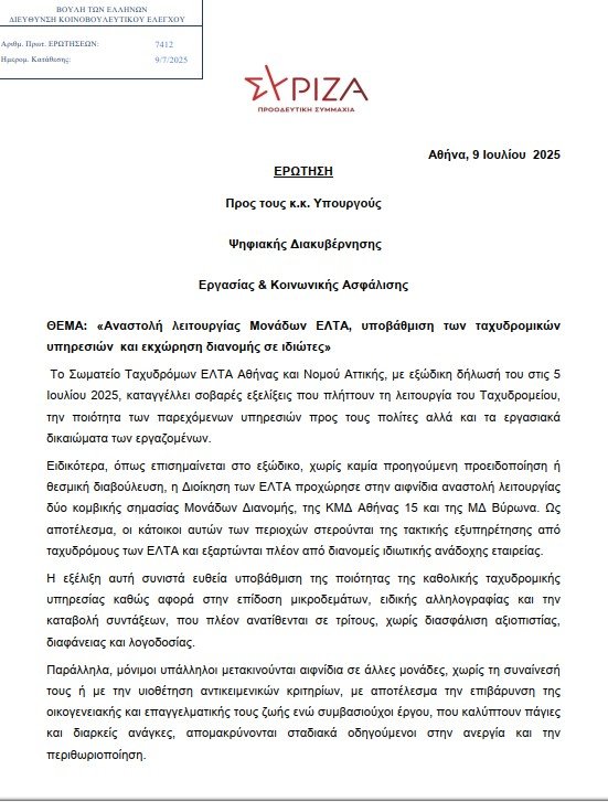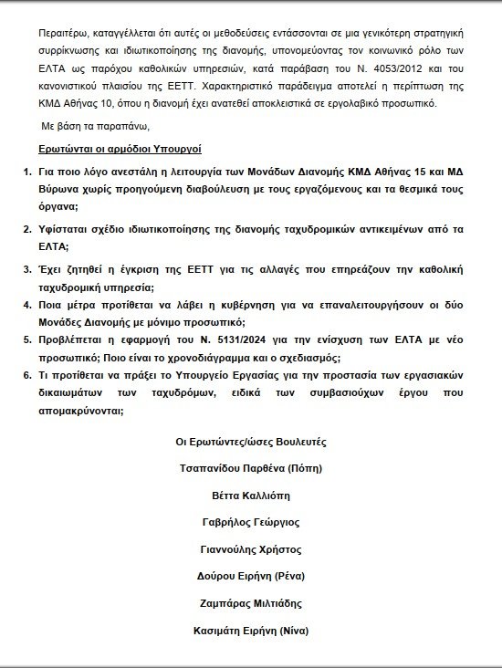 ΕΠΕΡΩΤΗΣΗ ΤΩΝ ΒΟΥΛΕΥΤΩΝ ΤΟΥ ΣΥΡΙΖΑ ΓΙΑ ΤΑ ΠΡΟΒΛΗΜΑΤΑ ΣΤΗ ΔΙΑΝΟΜΗ